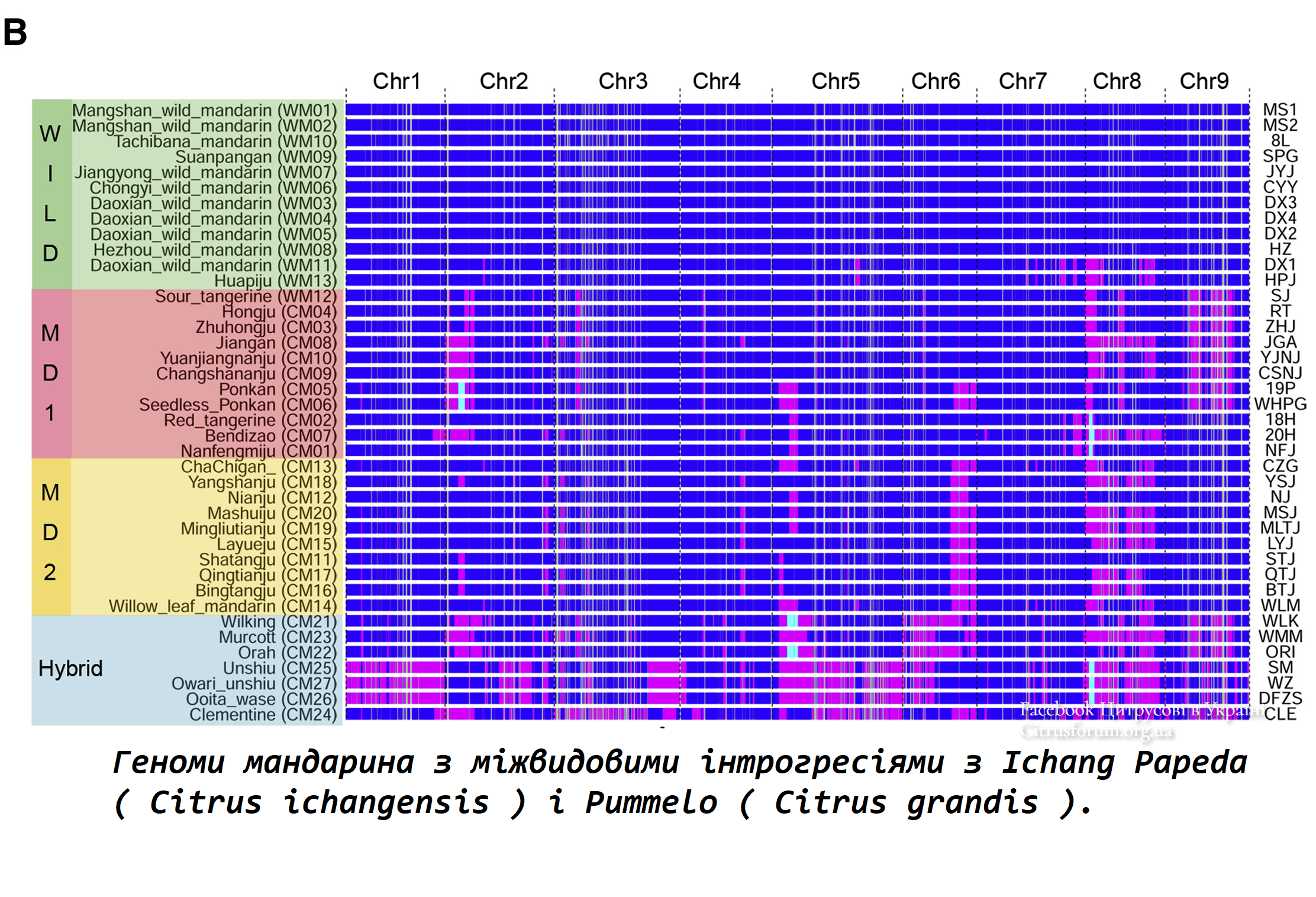 Зразки домішок 40 мандаринів, що демонструють інтрогресії поммело. Синій: чисте генетичне походження мандарина; пурпурний: гетерозиготне генетичне походження (мандарин/поммело); блакитний: чисте генетичне походження pummelo (pummelo/ pummelo); сірий: регіони не визначені.