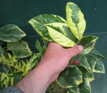 Пестролистный Тарокко. Имеет тенденцию отращивать время от времени полностью бесхлорофильные побеги с такими же листьями. Тоже ещё не цвёл у меня. Но, несмотря на всё это - красавчик)).