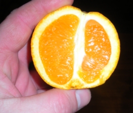 Апельсин Вашингтон Навел. Плоды от прошлогоднего летнего цветения (весенние завязи отвалились, потому что пересушил растение). Сорвал я его в первой половине февраля. Рассчитывал, что будет кислятина, поскольку дозревал конец осени - зима. Мало света, холодно. Но как он меня удивил! Оказался очень сладким, даже шкурка (хотя в ней эфирные масла, конечно присутствовали). Правда, некрупный. И пупок снаружи был незаметным, я уж даже подумал, что сорт не тот. Но при разрезе пупок всё-таки нашёлся)).