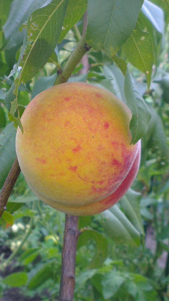 Персик, посаженый в прошлом году, дал первый урожай, два плодика :hi_hi_hi: , зато какие! Я честно признаться и не надеялся. Цвел плохо, около десятка цветков всего было. Сорт увы не помню.