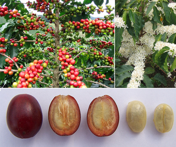 Происхождение: Тропическая Африка. Вечнозеленый тропический кустар-ник или небольшое деревце, достигающее в природе 2-3 метров в высоту. В роду Coffee насчитывается около 60 видов вечнозеленых кустарников и деревьев. Все они растут и культивируются в тропических климатических зонах. Но только половина – дают зерна кофе, и ещё меньший процент – имеют промышленное значение. Листья кофейного дерева – очень декоративны, блестящие, темно-зеленого цвета, кожистые, продолговатые, заостренные (15 см в длину и до 5 см в ширину). Цветет Кофейное дерево мелкими нежными белыми цветками, по форме по запаху, напоминающими жасмин. Основной период цветения приходится на летнее время. В природе – цветение и плодоношение возможно в течение всего года. Цветки развиваются в пазухах листьев, и собраны в группы по 20 штук в каждой. Часто бутоны зарождаются и из спящих почек на стволе кофейного дерева. Цветки держаться сравнительно не долго и сменяются завязями округлых, немного вытянутых плодов. Самоопыляемый вид. Плод-костянка имеет два крупных семени, покрытых тонкой сладковатой кожицей. В процессе созревания, плоды меняют свой цвет от темно-зеленого до ярко-красного. Плоды зреют в течение 6-8 месяцев. Растения, выращенные из семян, готовы к плодоношению на 3-5 год.